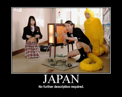 Demotivator description: Very strange scene: three people - one man dressed in yellow, furry costume with tail; one man holding his hands to a prayer, dressed in the top of suit and with black knee high socks; woman dressed in a schoolgirl outfit with some tube attached to her navel (belly button). The tube is going to WTF box. Something green is dripping form the box on the floor like this "machine" is sucking something out from the girl. At the floor there are also some gizmo and bag. Whole scene is taking place at corridor (passage).